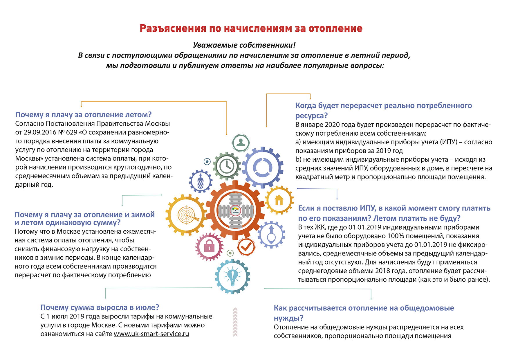 Разъяснения по методике начислений за отопление для всех домов под управлением группы Смарт Сервис, кроме ЖК, в которых все помещения оборудованы приборами учета от застройщика. В последних - расчет за отопление ведется по фактическому потреблению, исходя из показаний приборов учёта.
